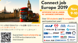 What is Connect Job, you ask? With a network of 700 universities worldwide, we are supporting young talents form 100+ countries to take challenges overseas. HQ in Japan and 10 brunches around the world. Our recruitment events have 38,000 participants in 20 countries (2009-2014). There will be also the biggest interview fair in London this coming November, planned and hosted by Connect Job Agent. Every year there are a lot of renowned Japanese big corporations flying into London to recruit both Japanese and non-Japanese students with Japanese language skills, from all over Europe! Connect Job Agent serves as a bridge between students and companies, supporting you all the way through to the final selection stage.